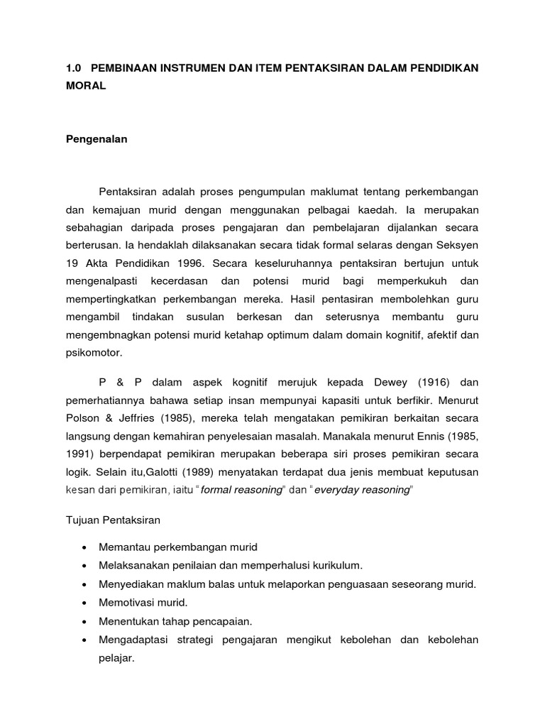 MEMBINA INSTRUMEN INSTRUMEN PENTAKSIRAN DAN ITEM PENTAKSIRAN FORMAL DAN TIDAK FORMAL BERDASARKAN JENIS-JENIS INSTRUMEN YANG BERIKUT. Jadual di atas menunjukkan kertas soalan Pendidikan Moral terdiri daripada 40 soalan objektif bagi tahun 5. Kasih Sayang Terhadap Keluargaan Aras.