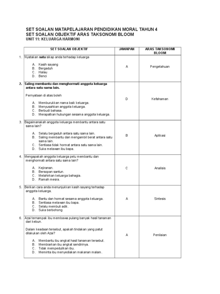 T soalan matapelajaran pendidikan moral tahun 4 set soalan objektif aras taksonomi bloom unit 11. Ashworth 1982 dalam Testing For Continous Assess. KELUARGA HARMONI SET SOALAN OBJEKTIF.